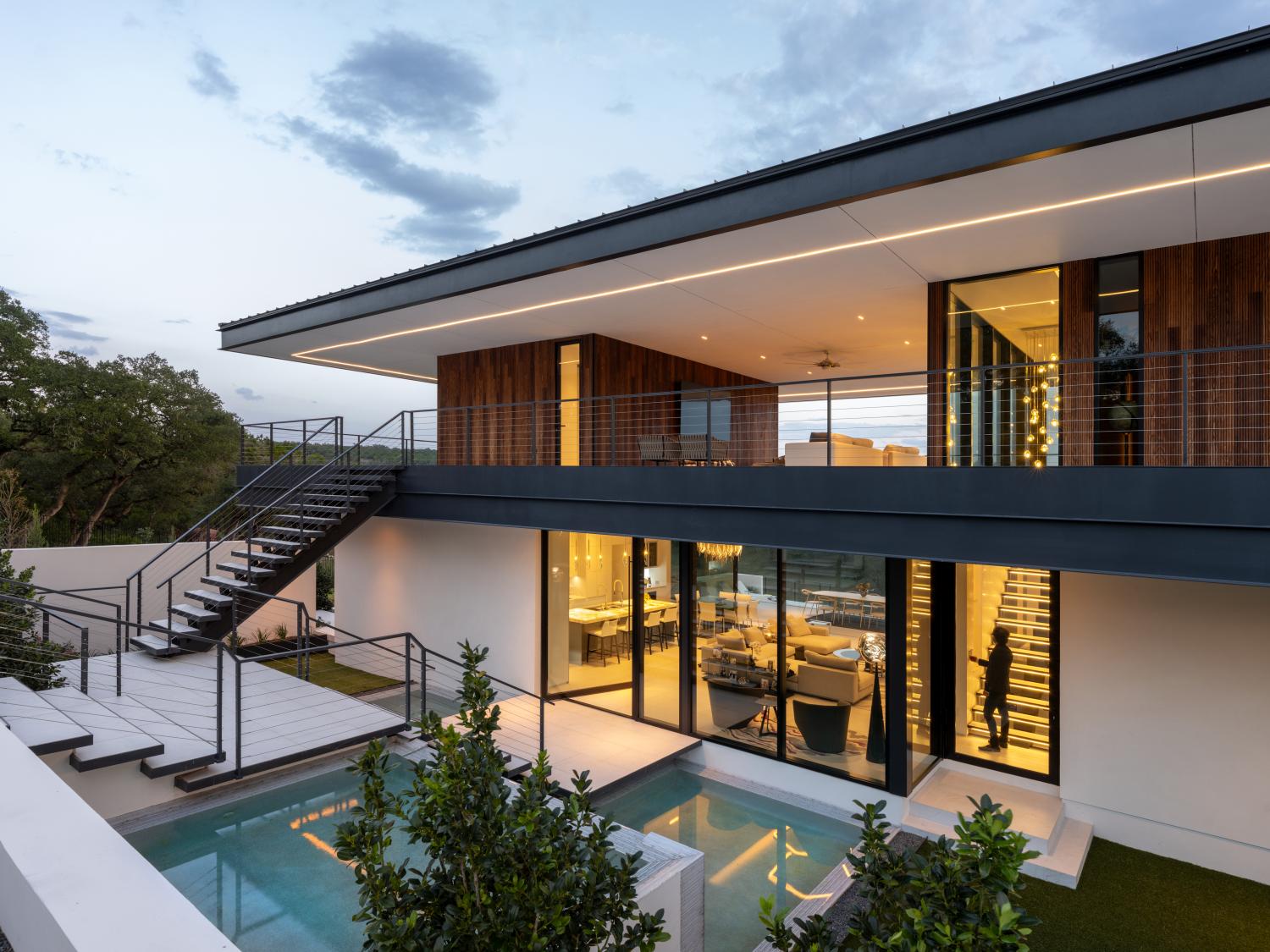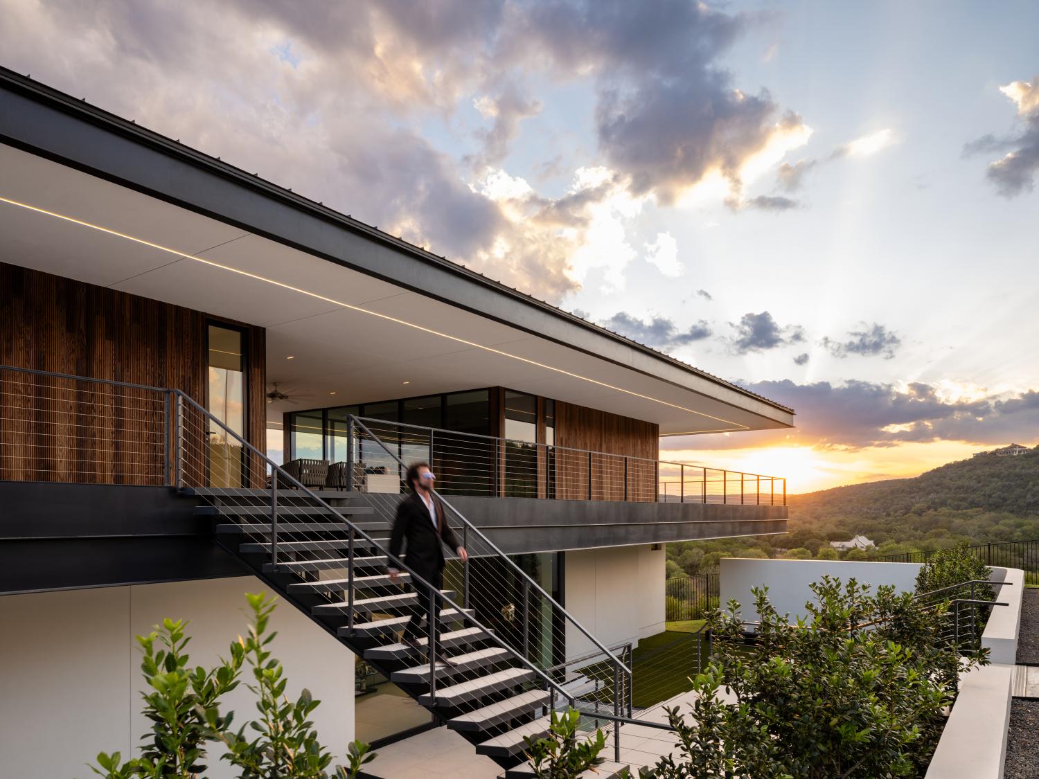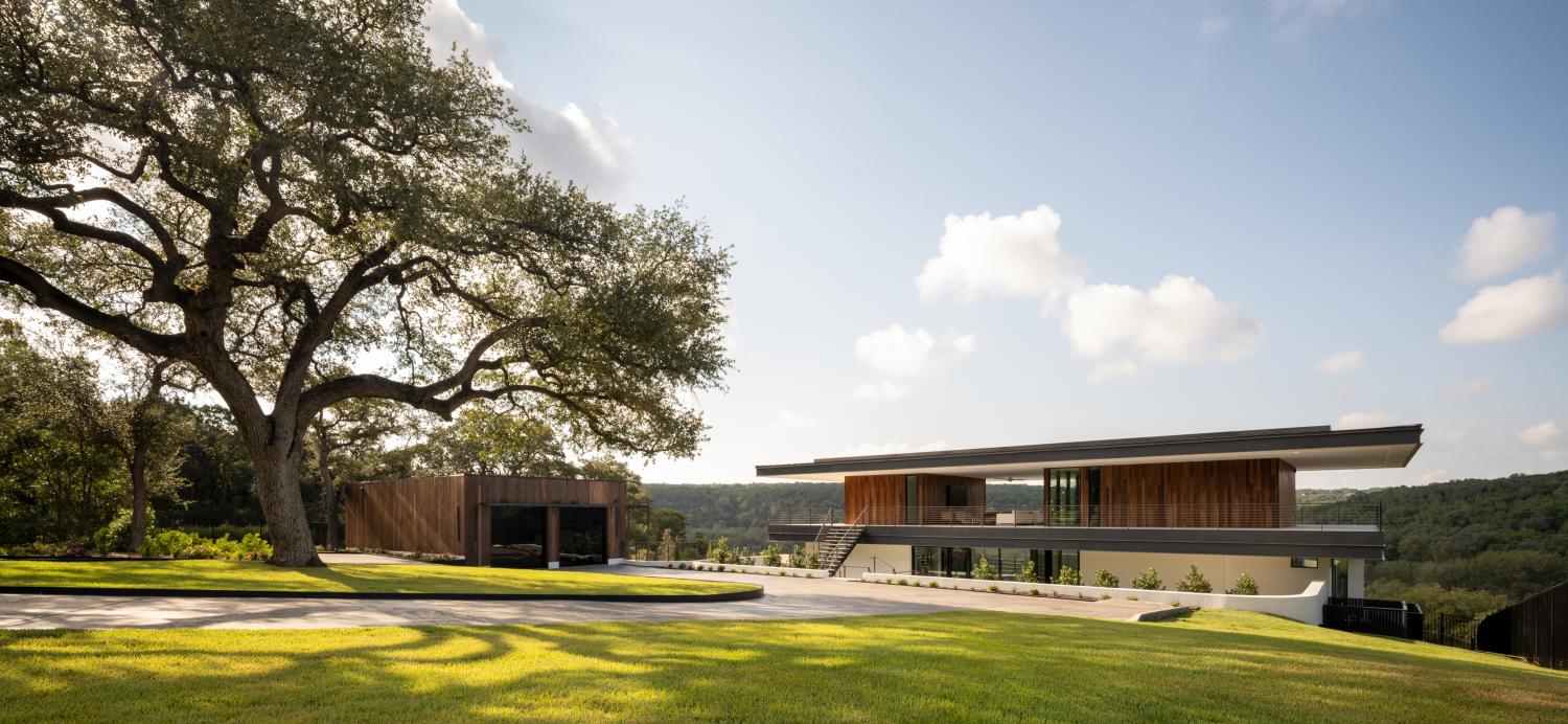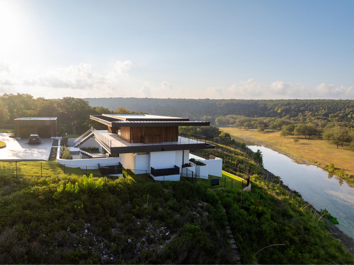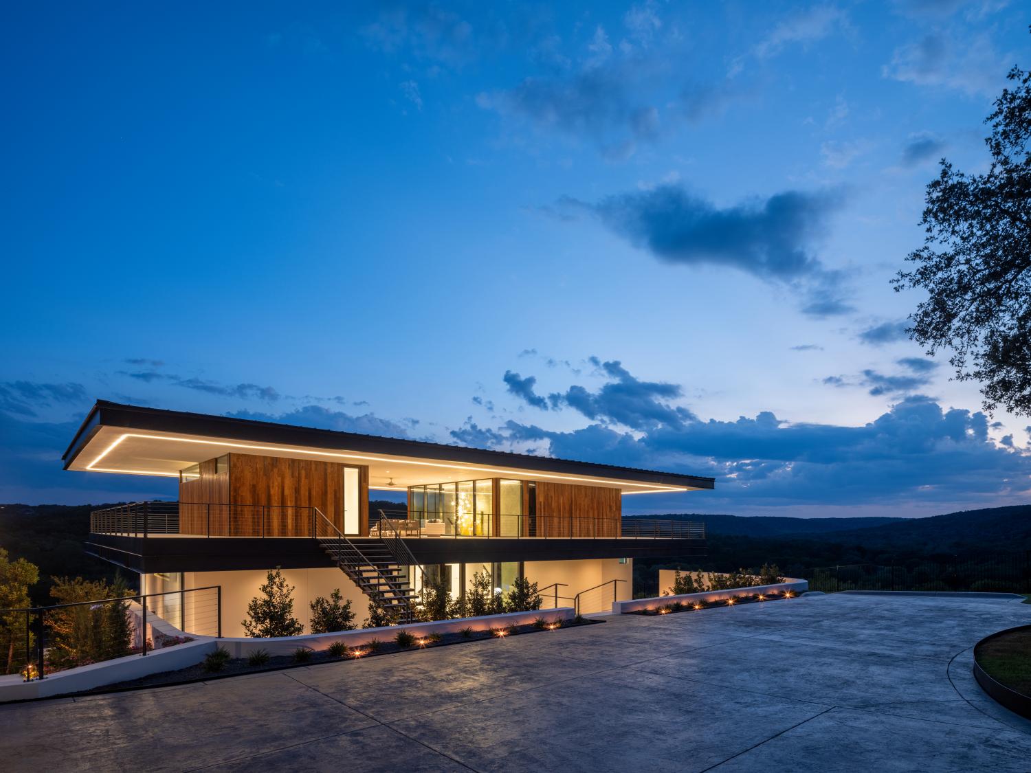 Custom home built on a 200 acre ranch on a bluff high above the Blanco river, just outside of Wimberley, TX. We were responsible for the full structural steel build, all interior and exterior stairs and railings, all steel landscaping elements, and all metal accent work.
