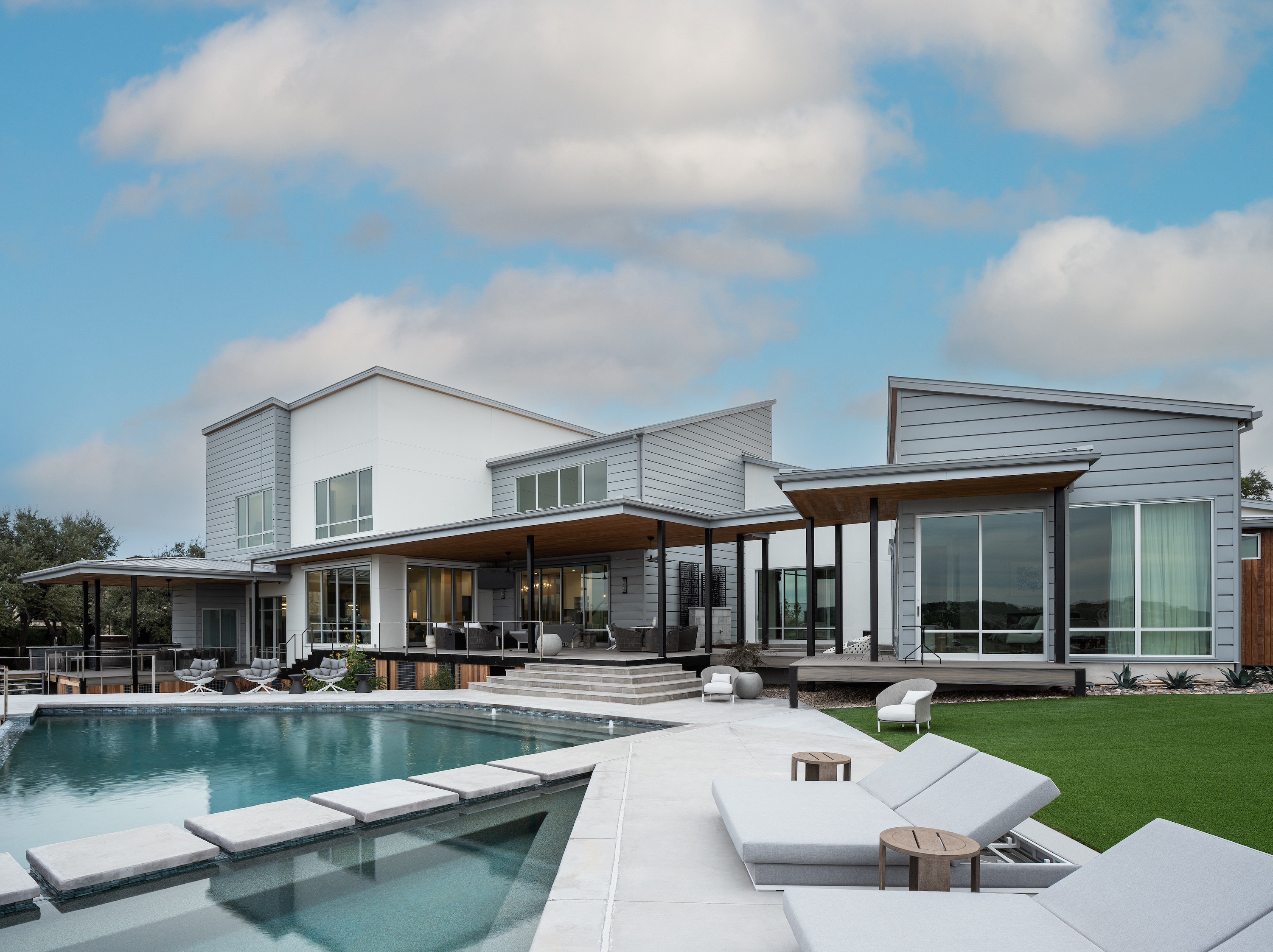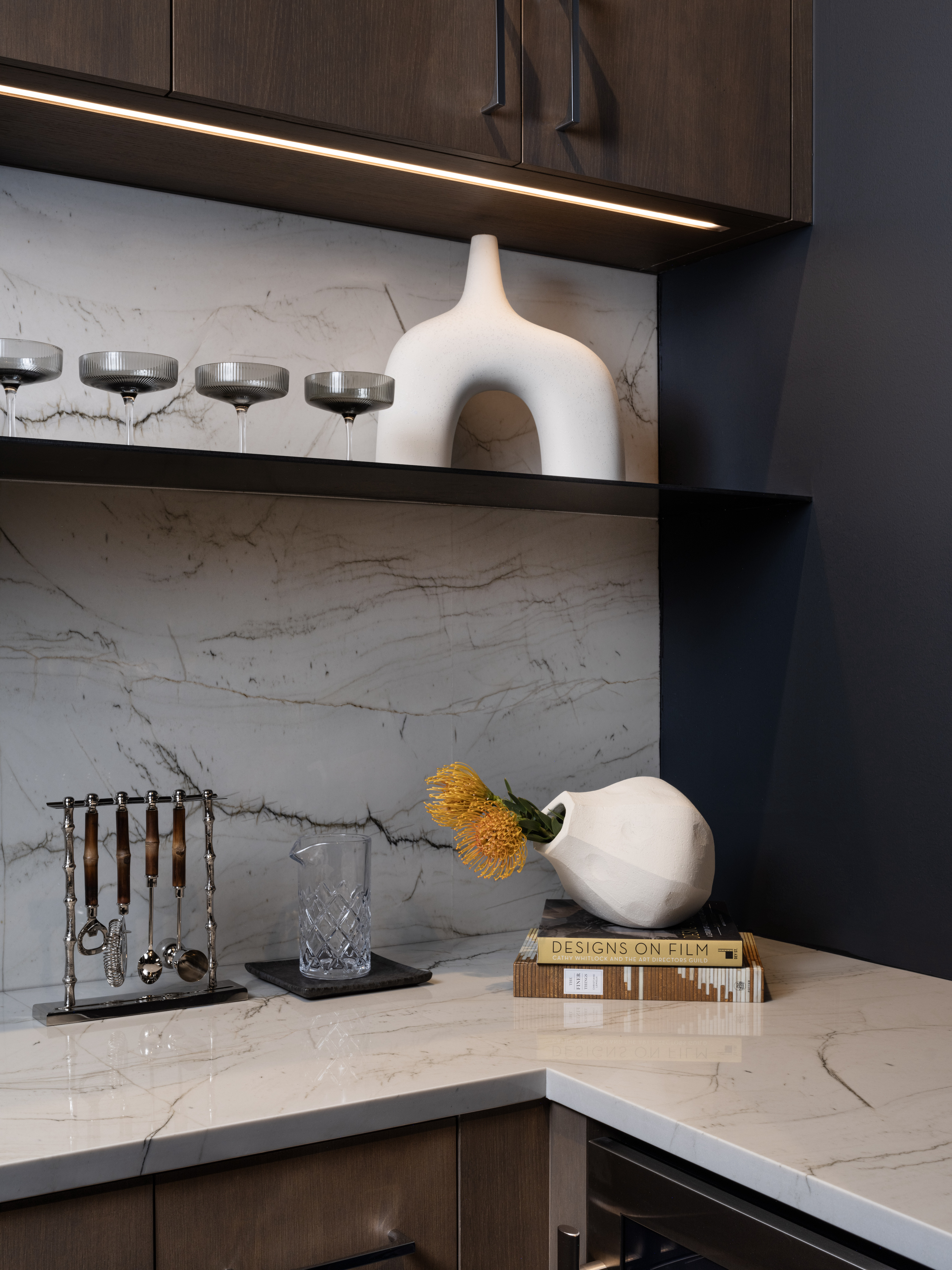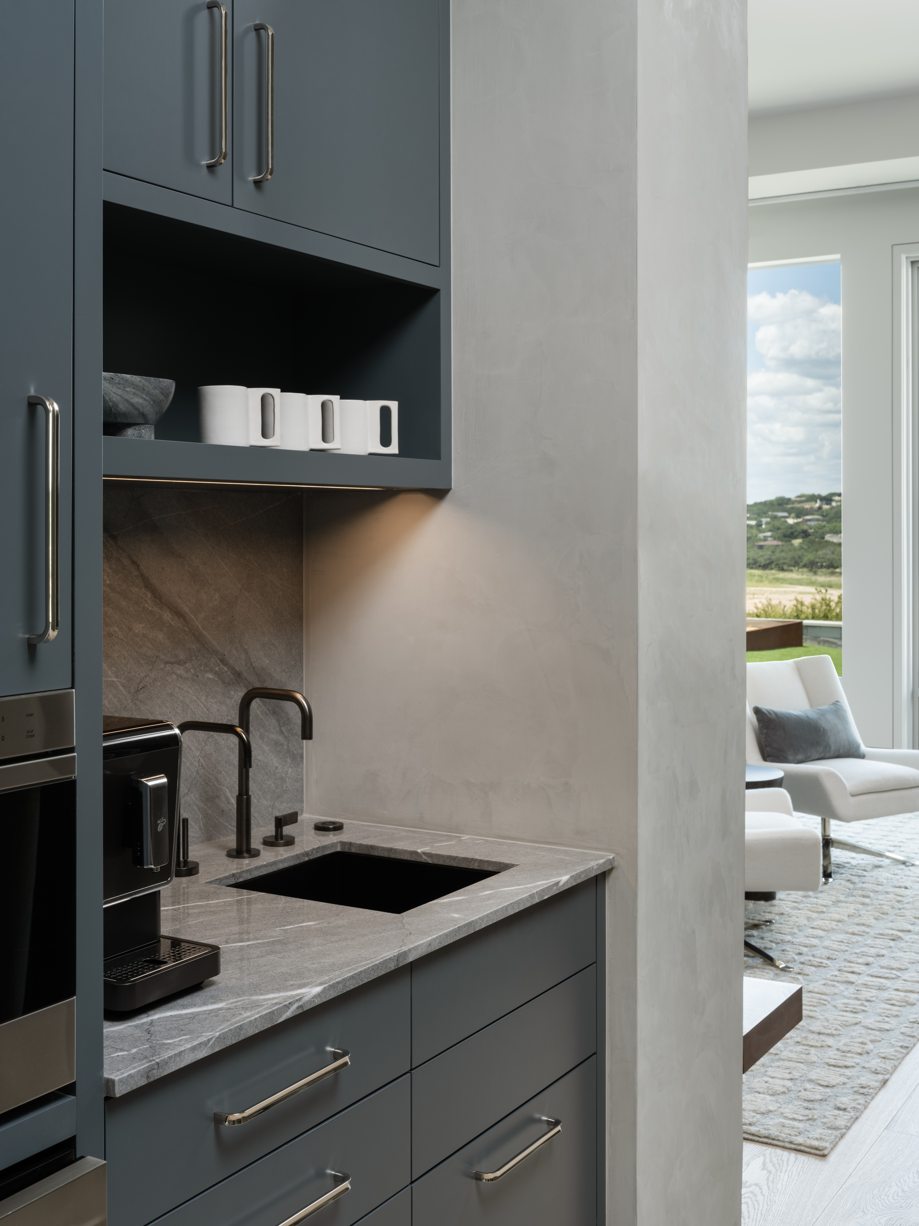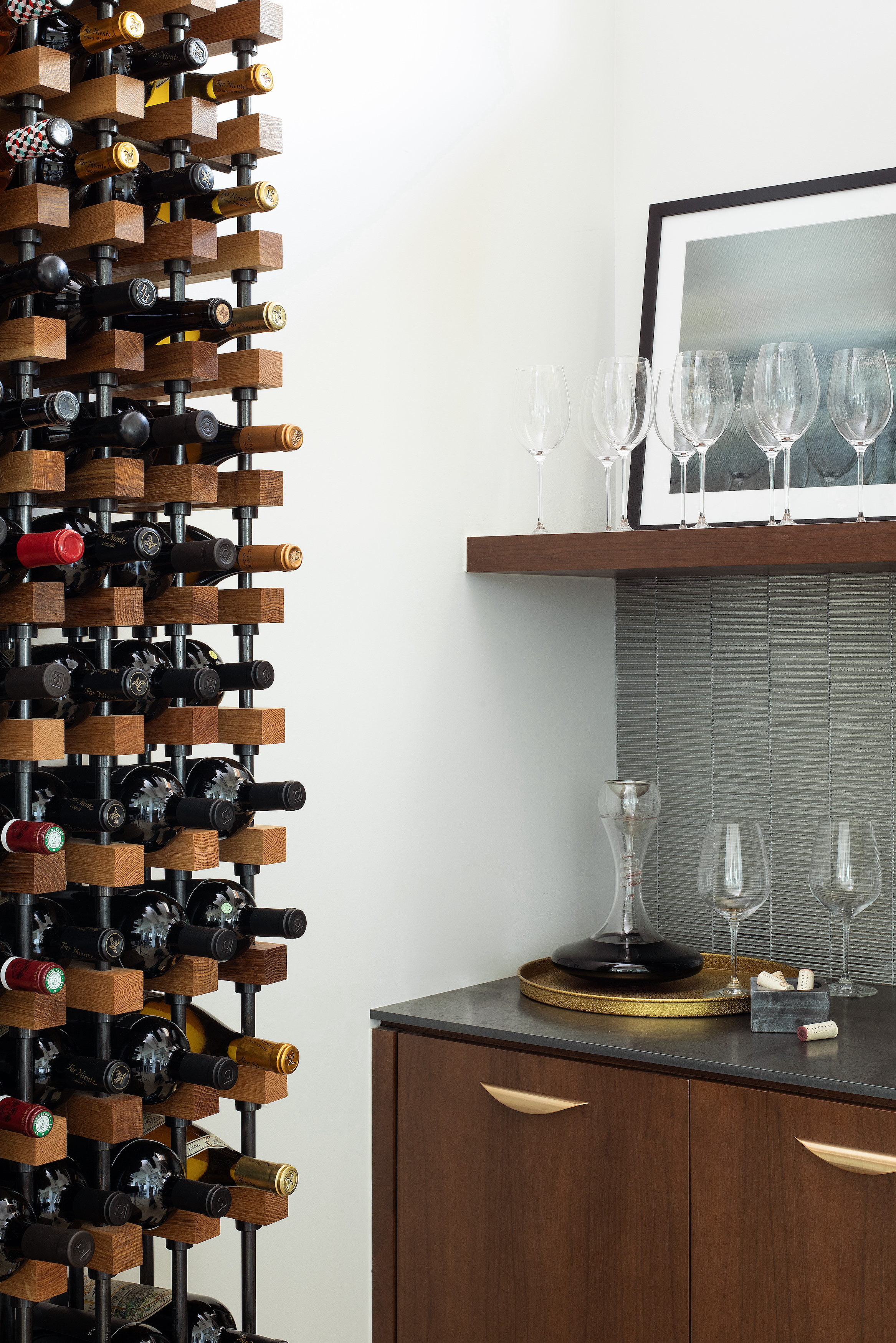 The "Flying J" project is a contemporary residential design in Austin, Texas. The project features custom millwork, including a specialized bar area, and highlights a warm palette of walnut, bronze, and metal work.
