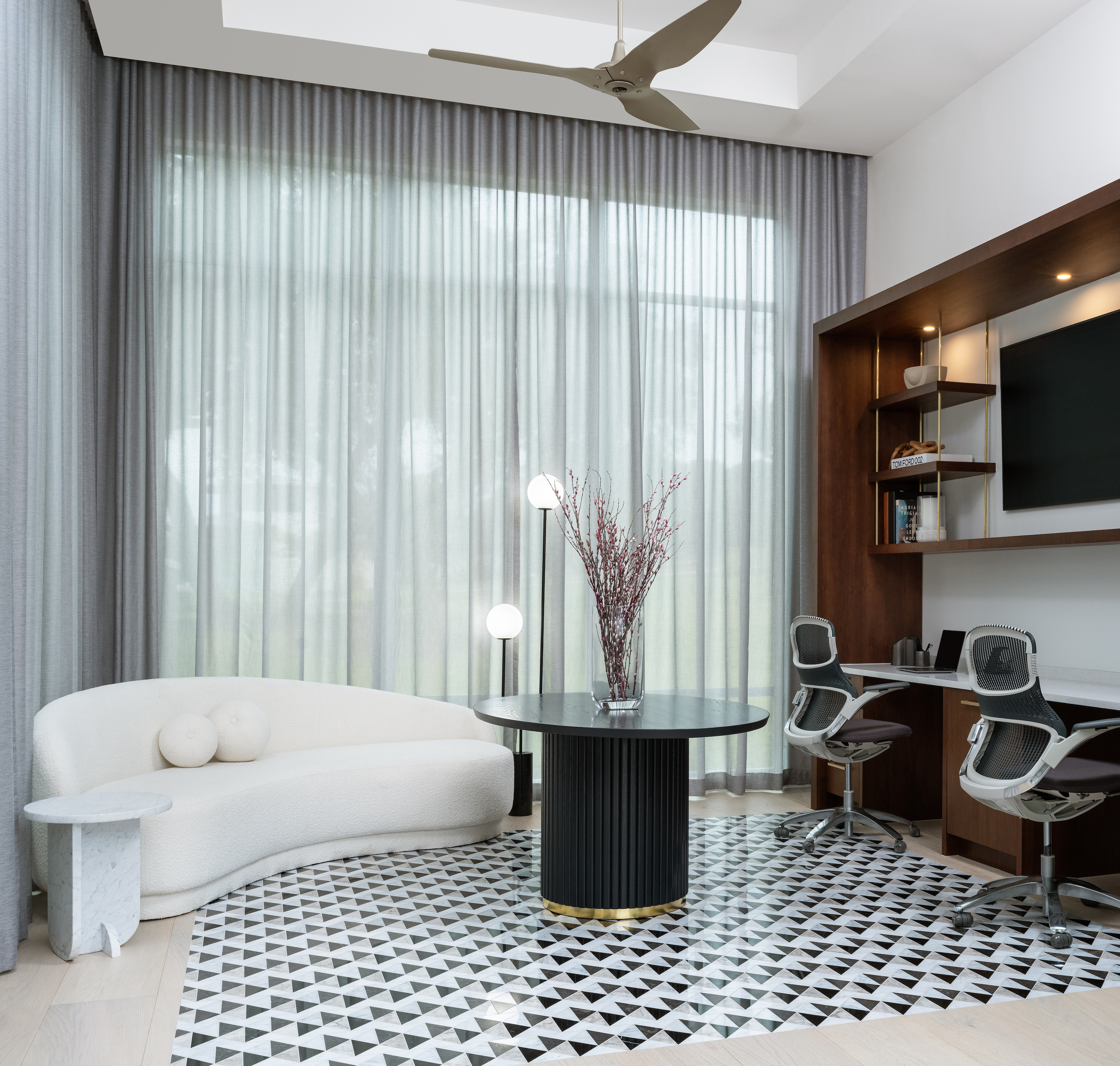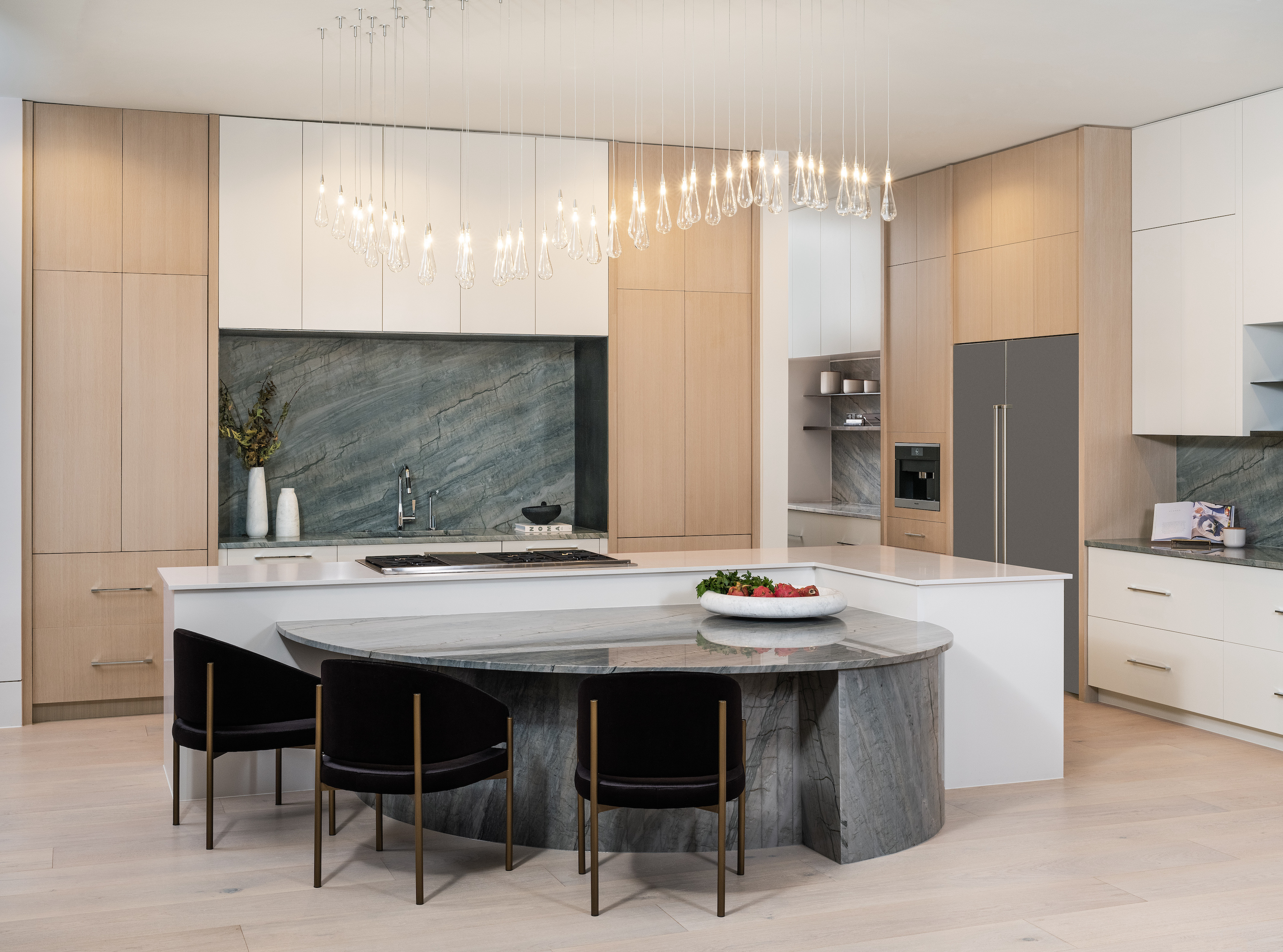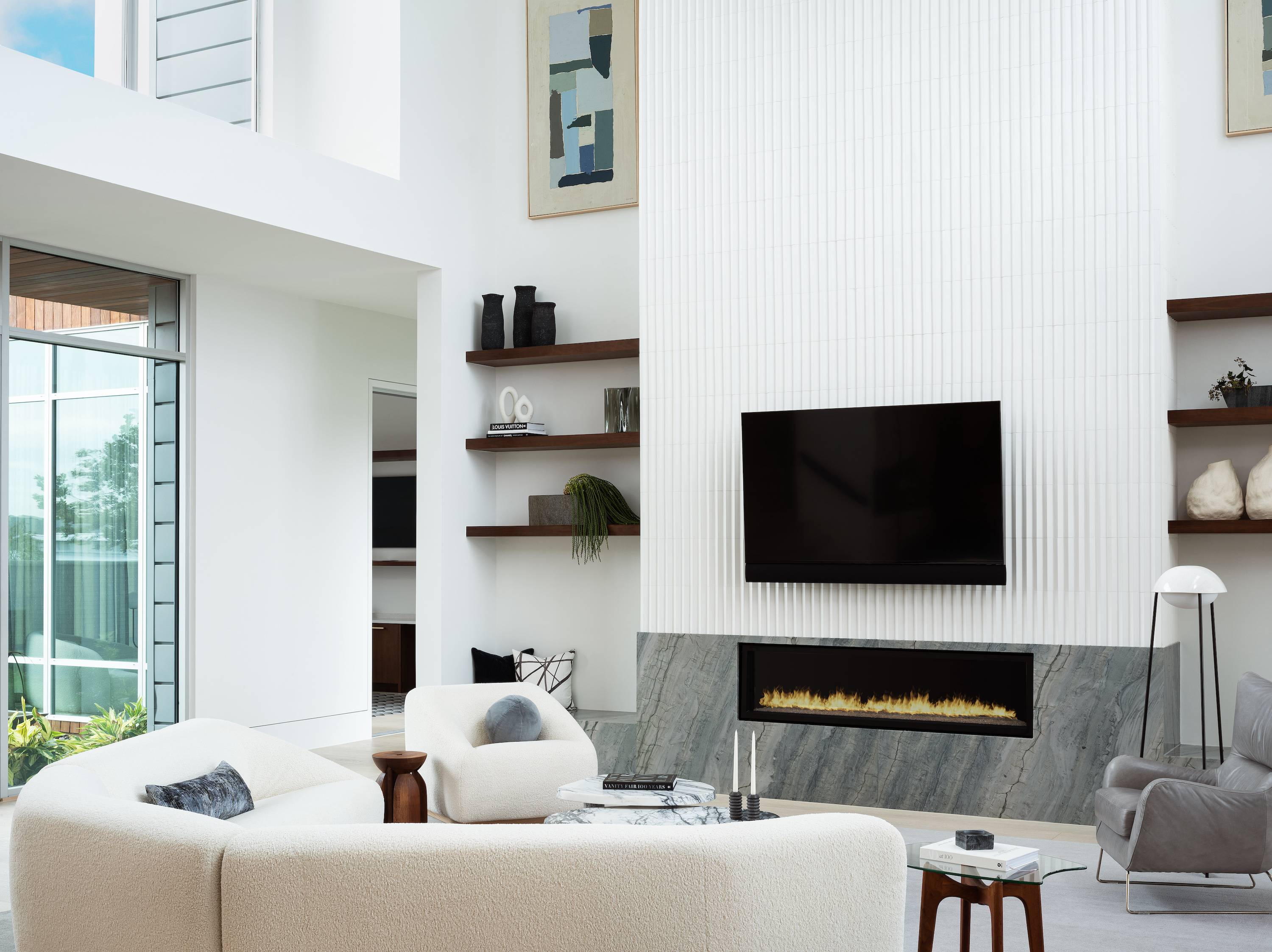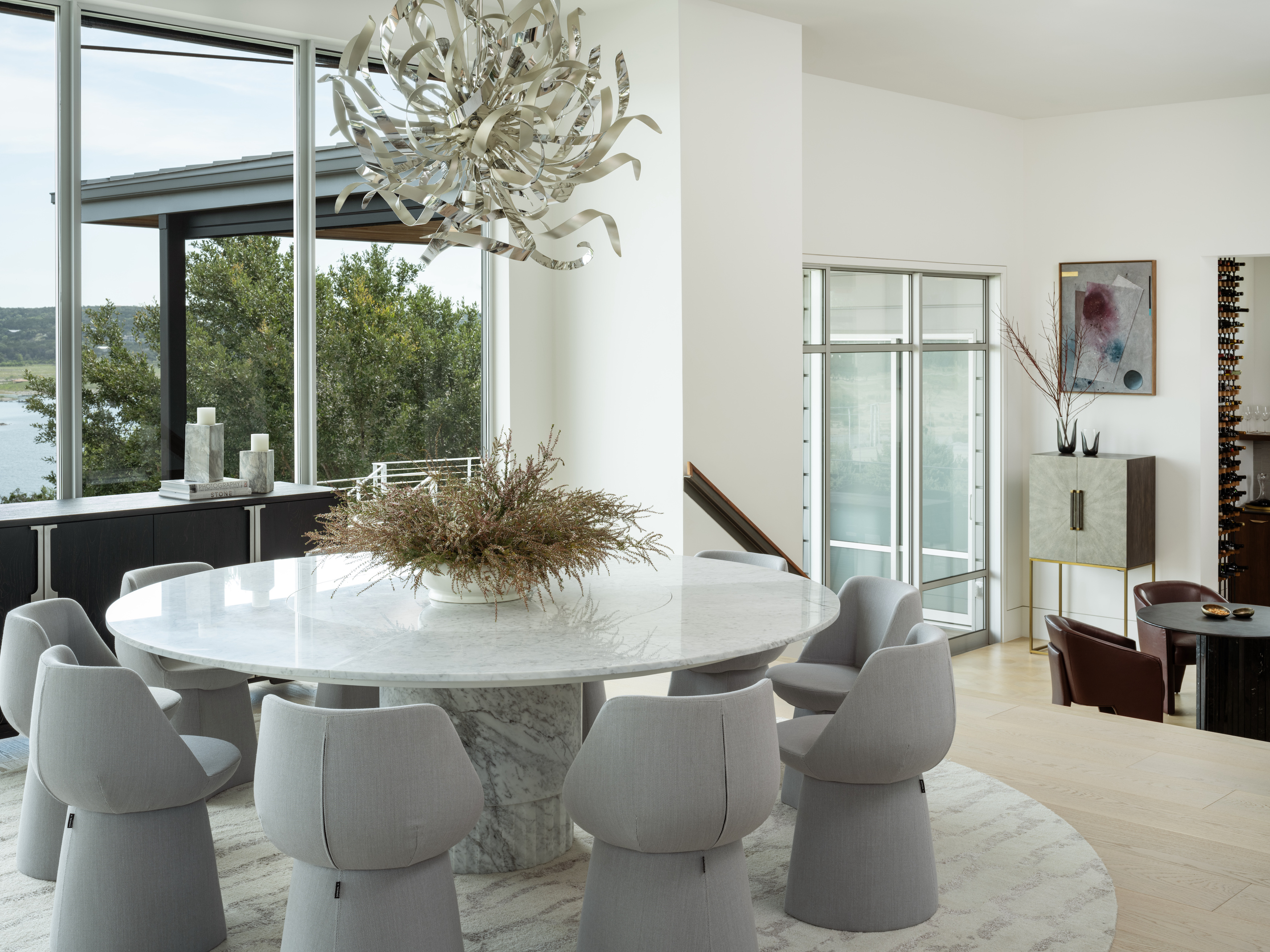 The "Flying J" project is a contemporary residential design in Austin, Texas. The project features custom millwork, including a specialized bar area, and highlights a warm palette of walnut, bronze, and metal work.