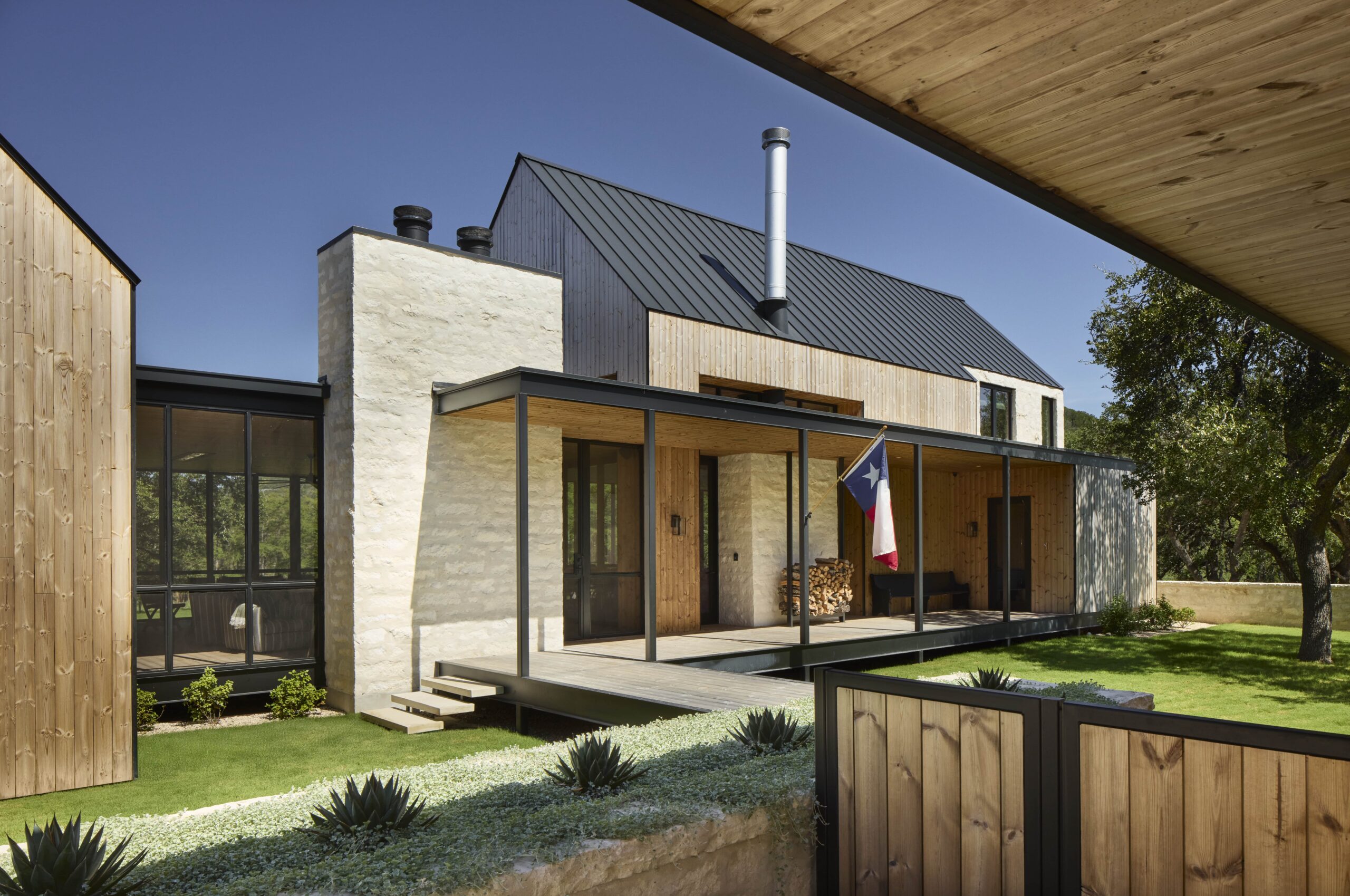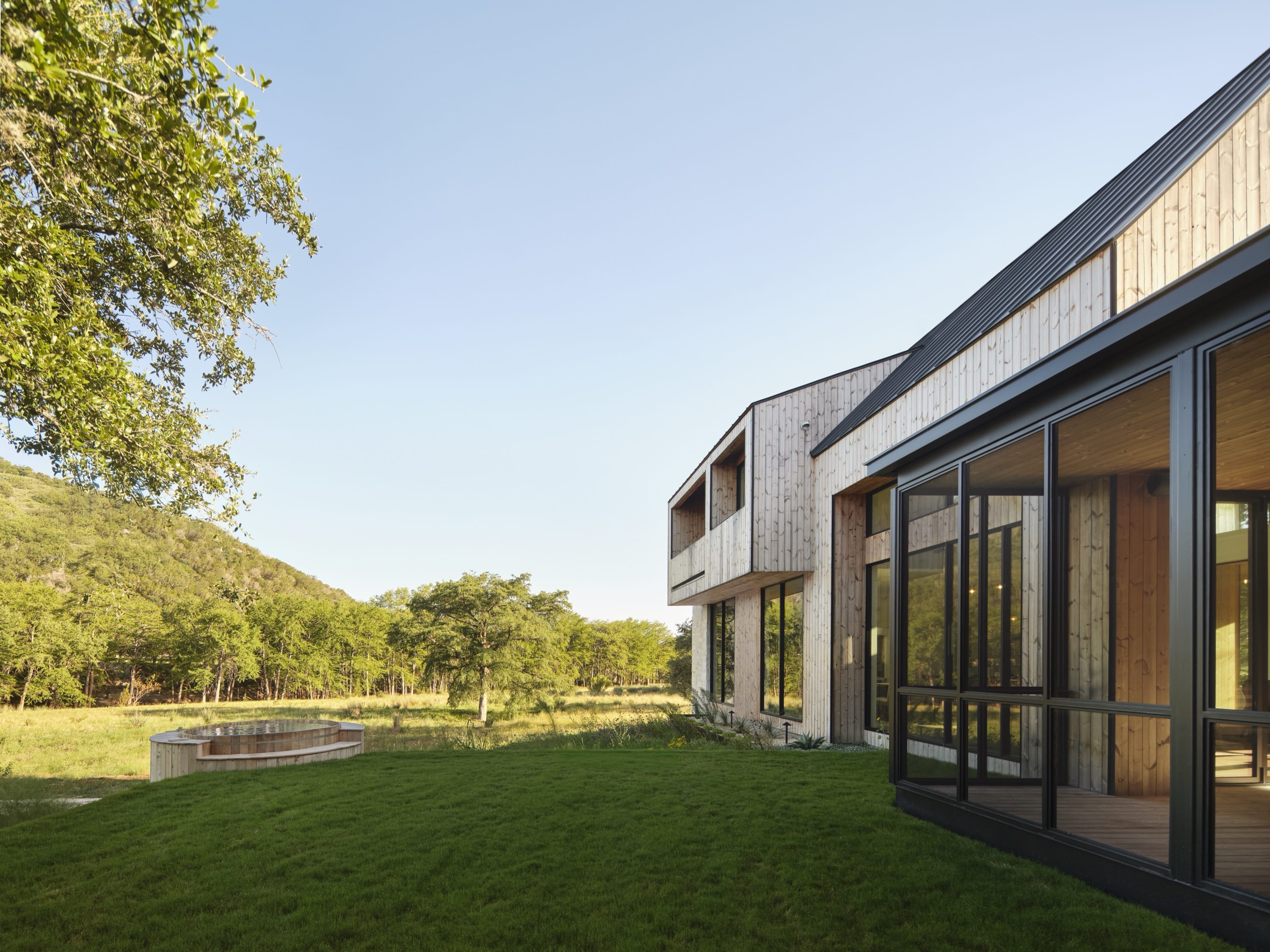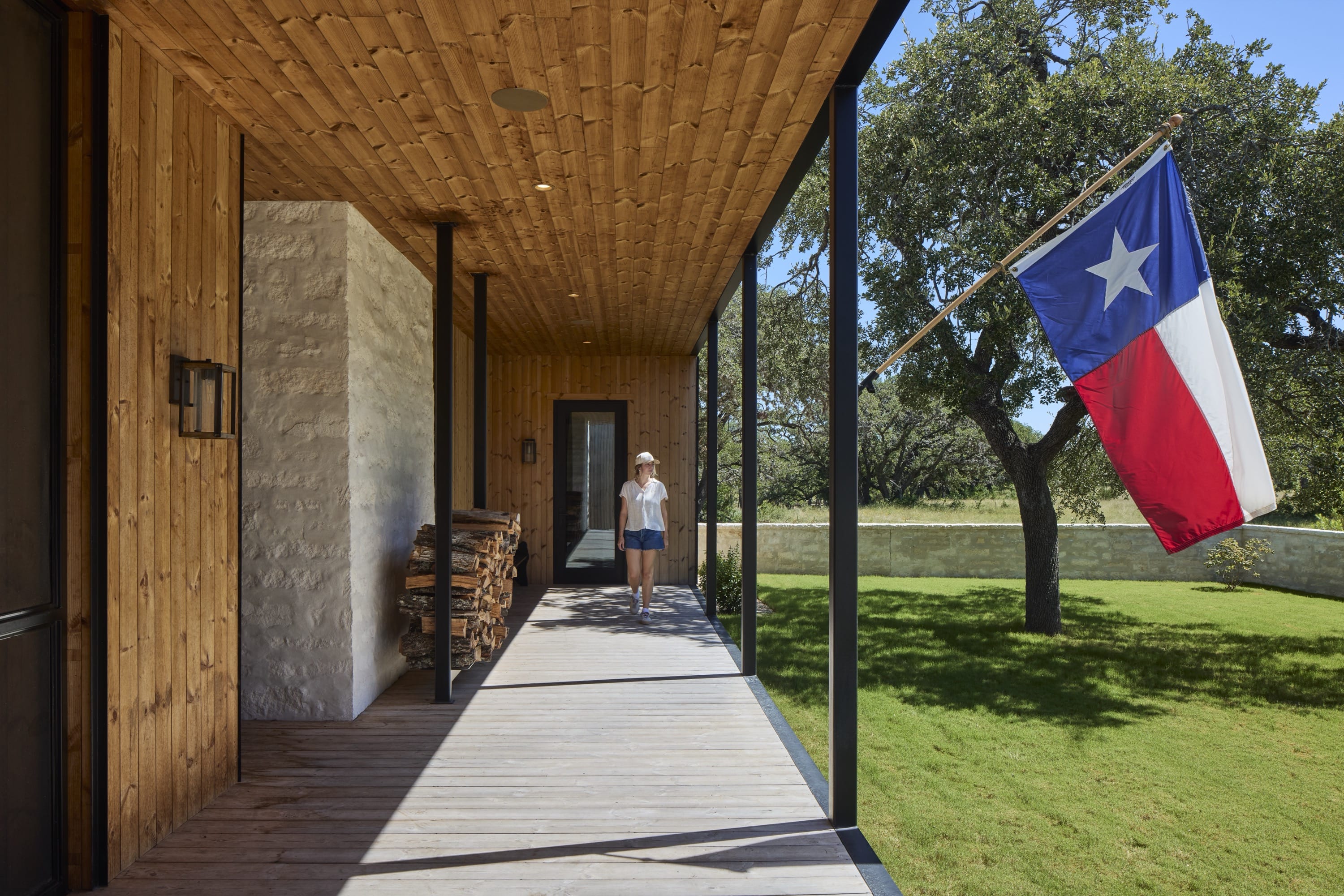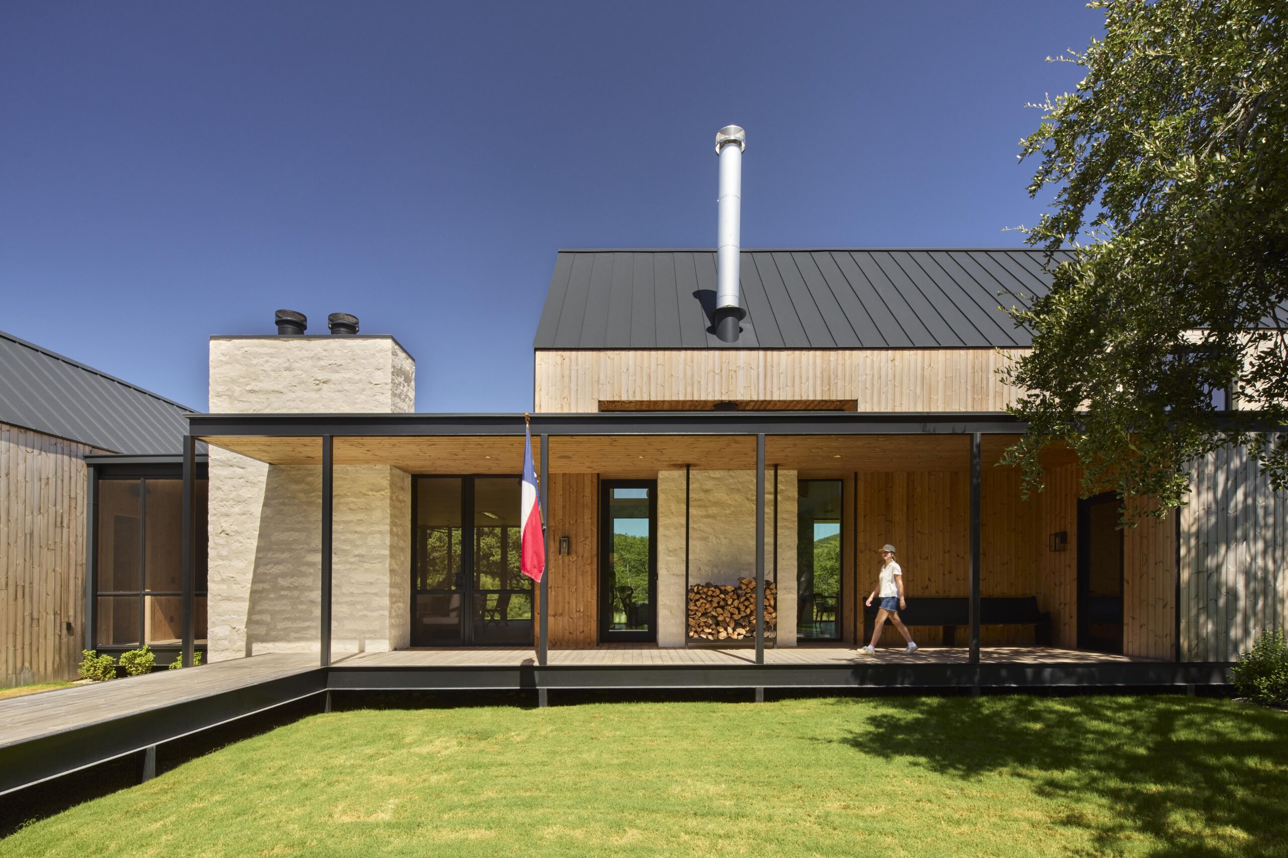 This residence is situated just off the Frio River in Concan, Texas. Conceptually, the house is organized as a suite of smaller buildings linked by a raised boardwalk and large screen porch.