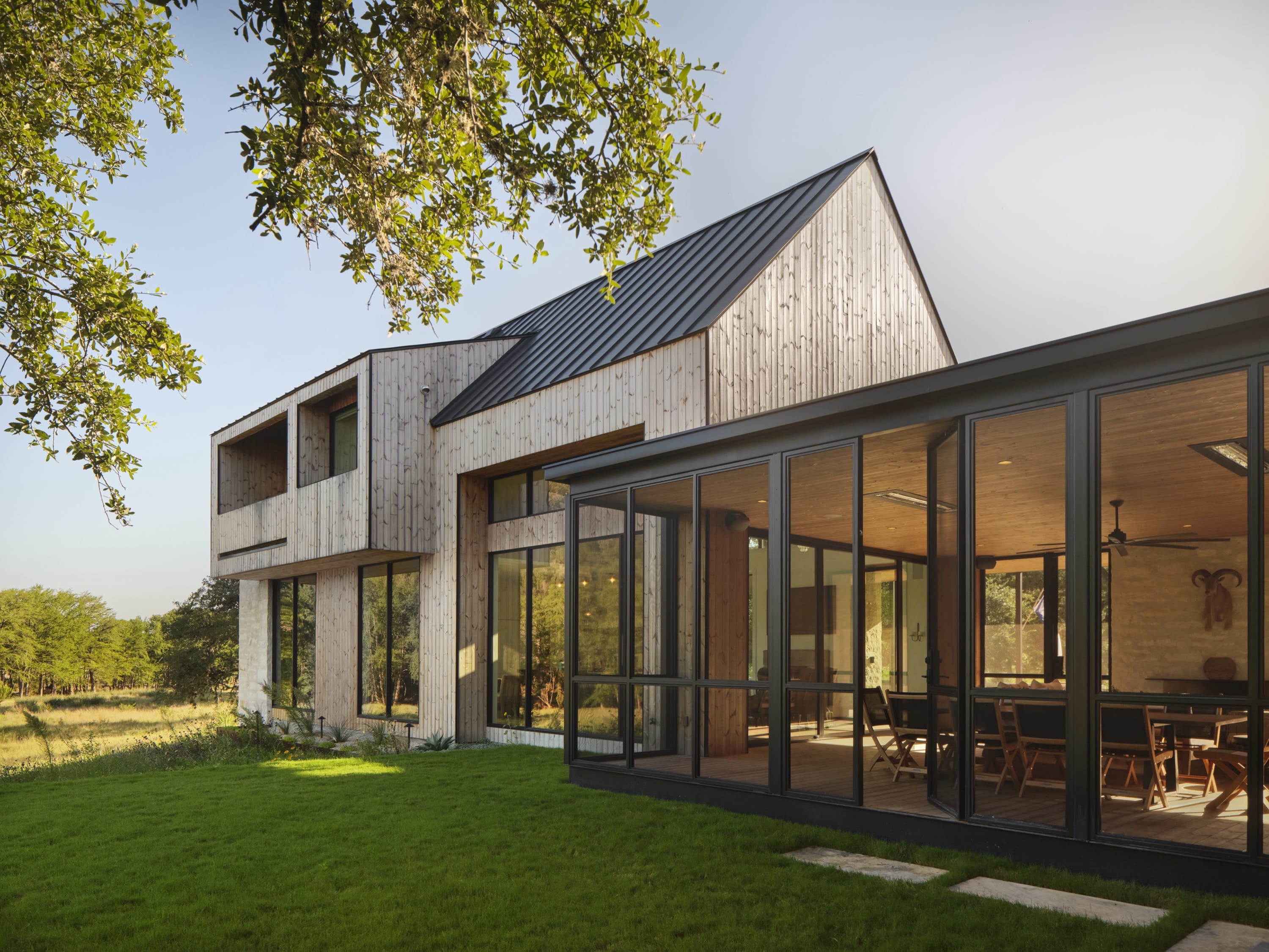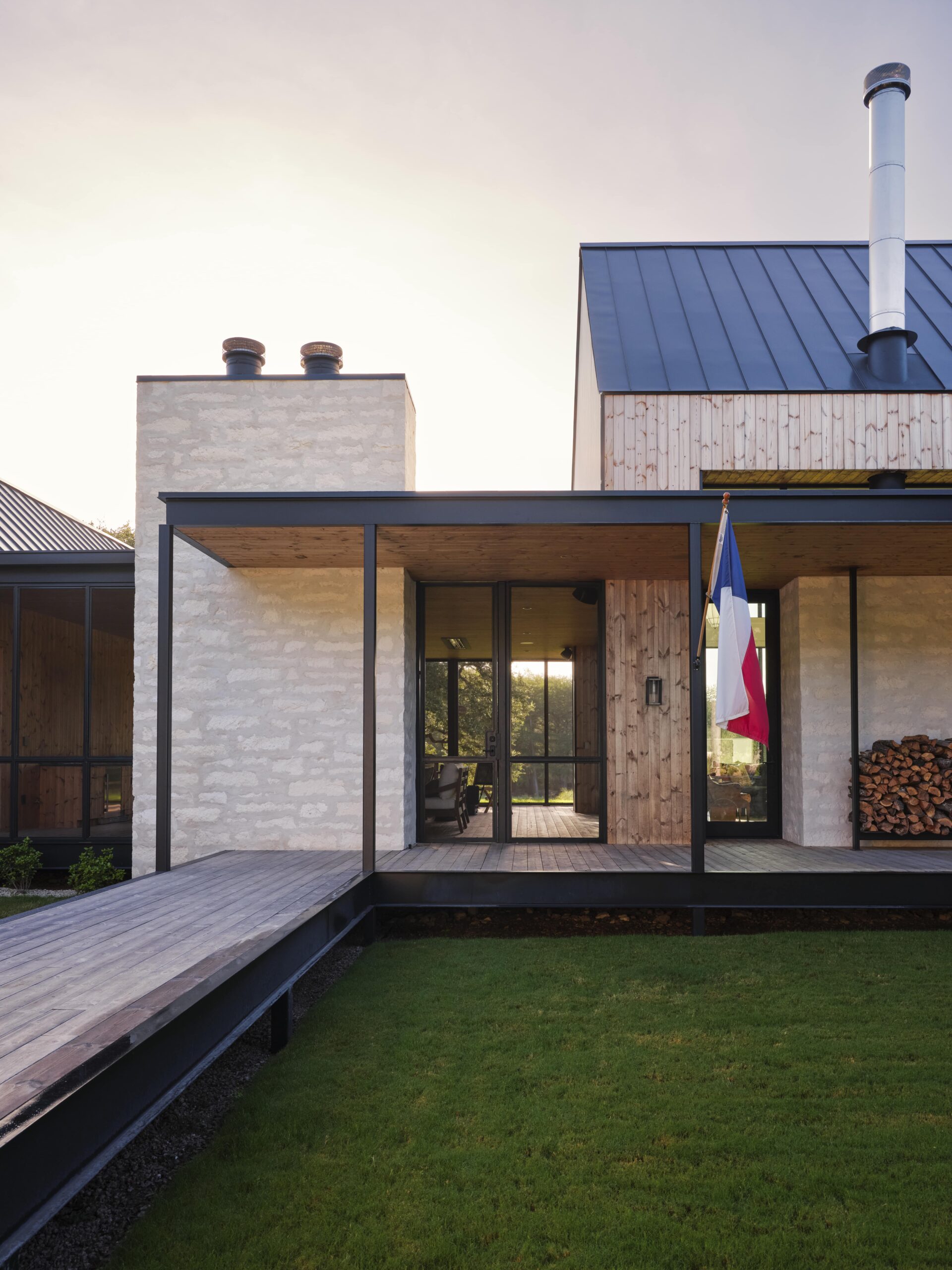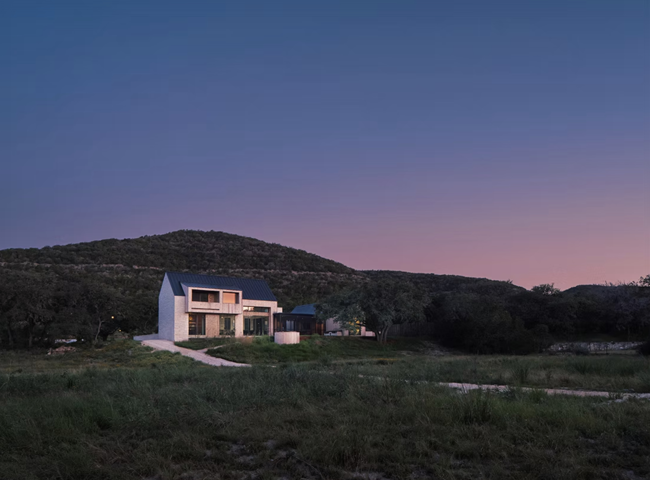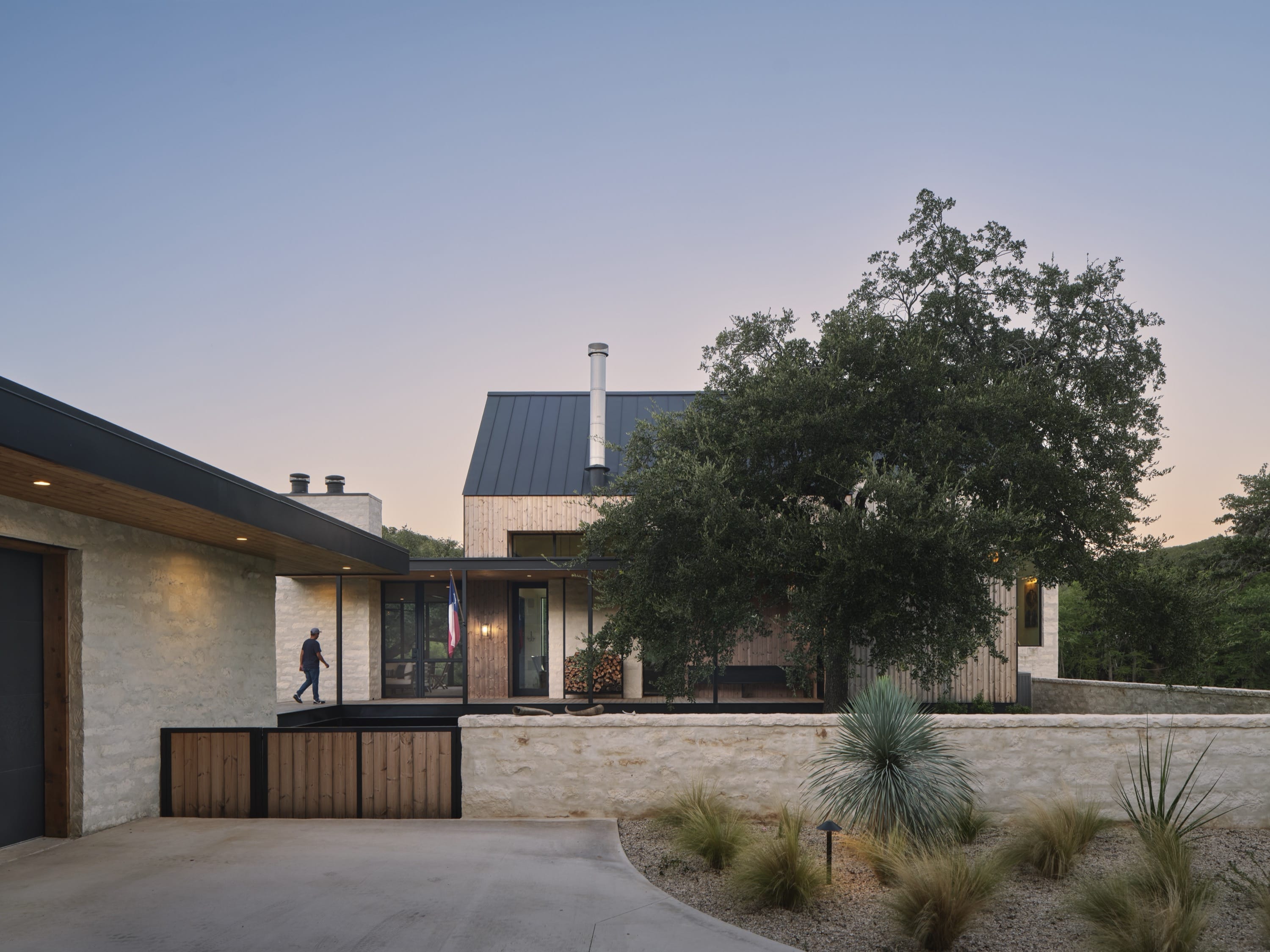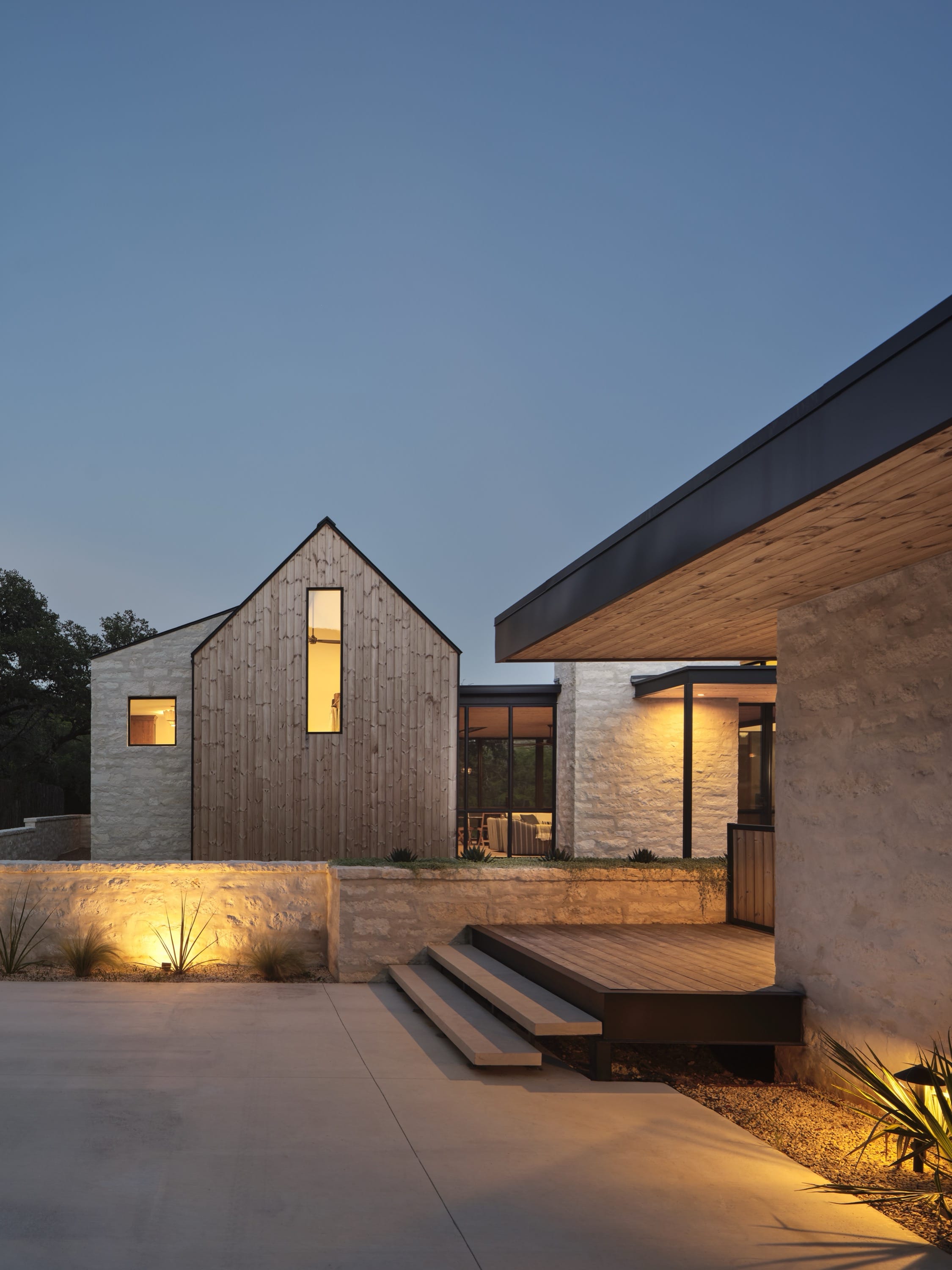 This residence is situated just off the Frio River in Concan, Texas. Conceptually, the house is organized as a suite of smaller buildings linked by a raised boardwalk and large screen porch.
