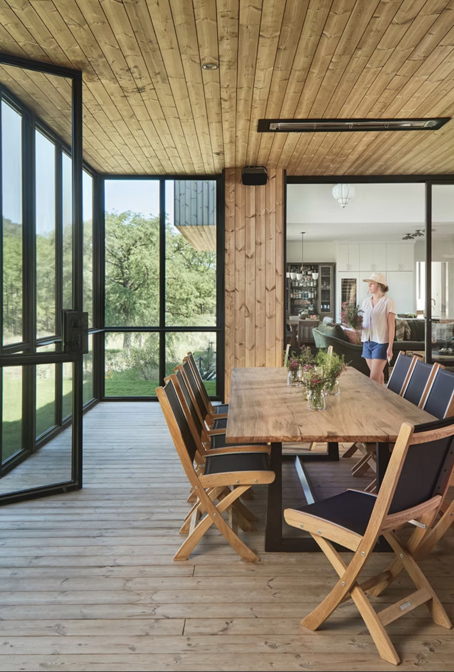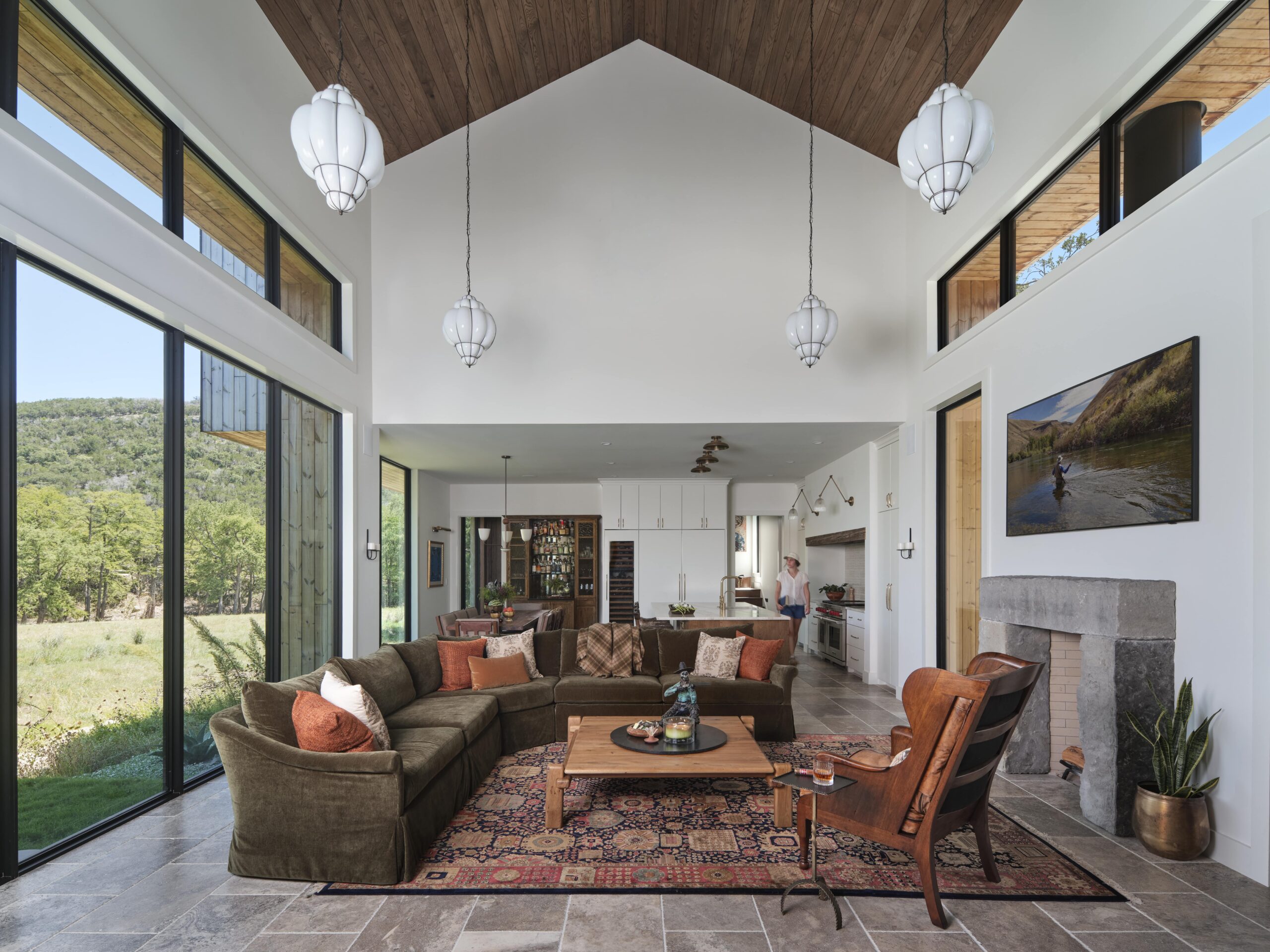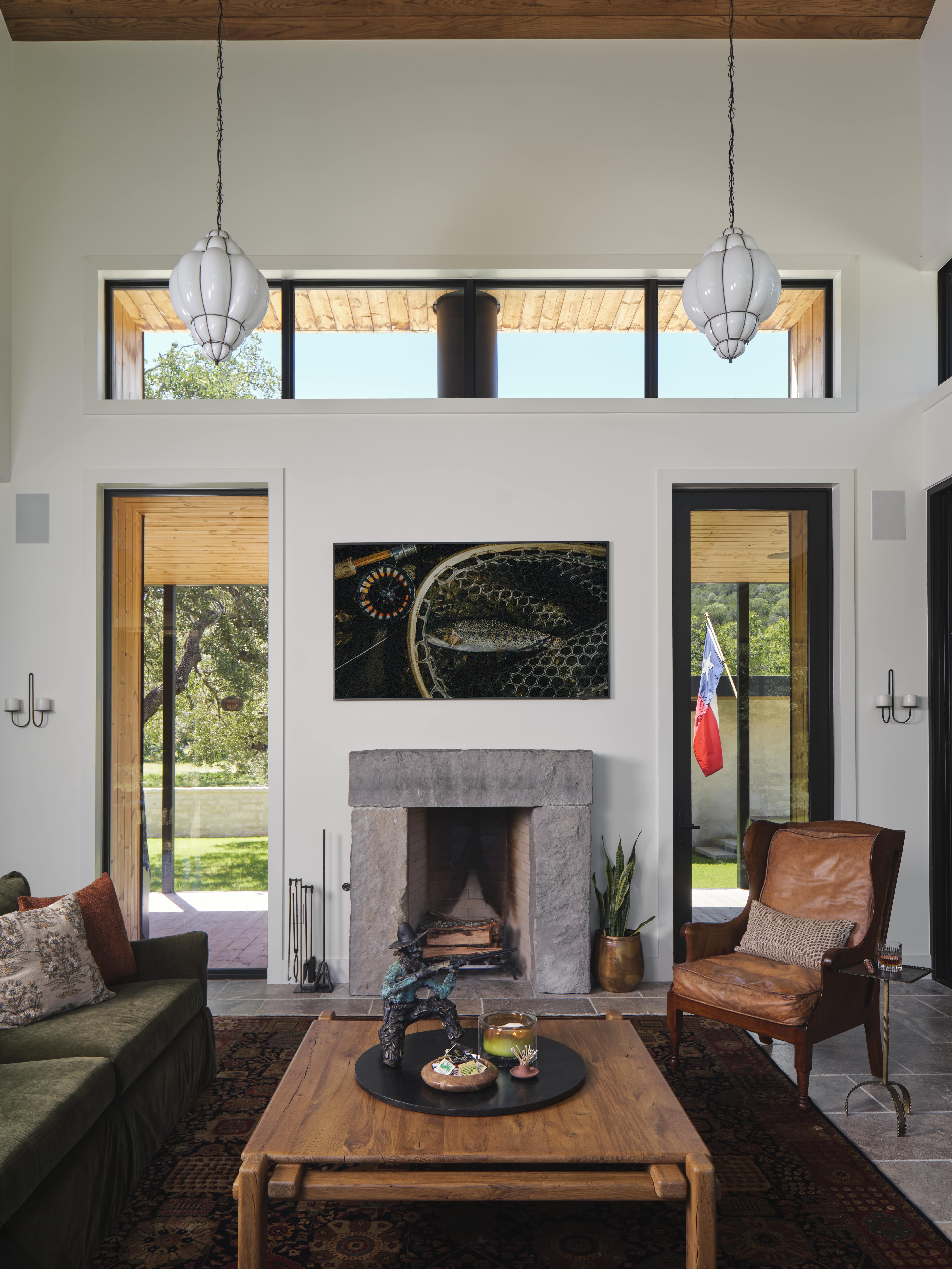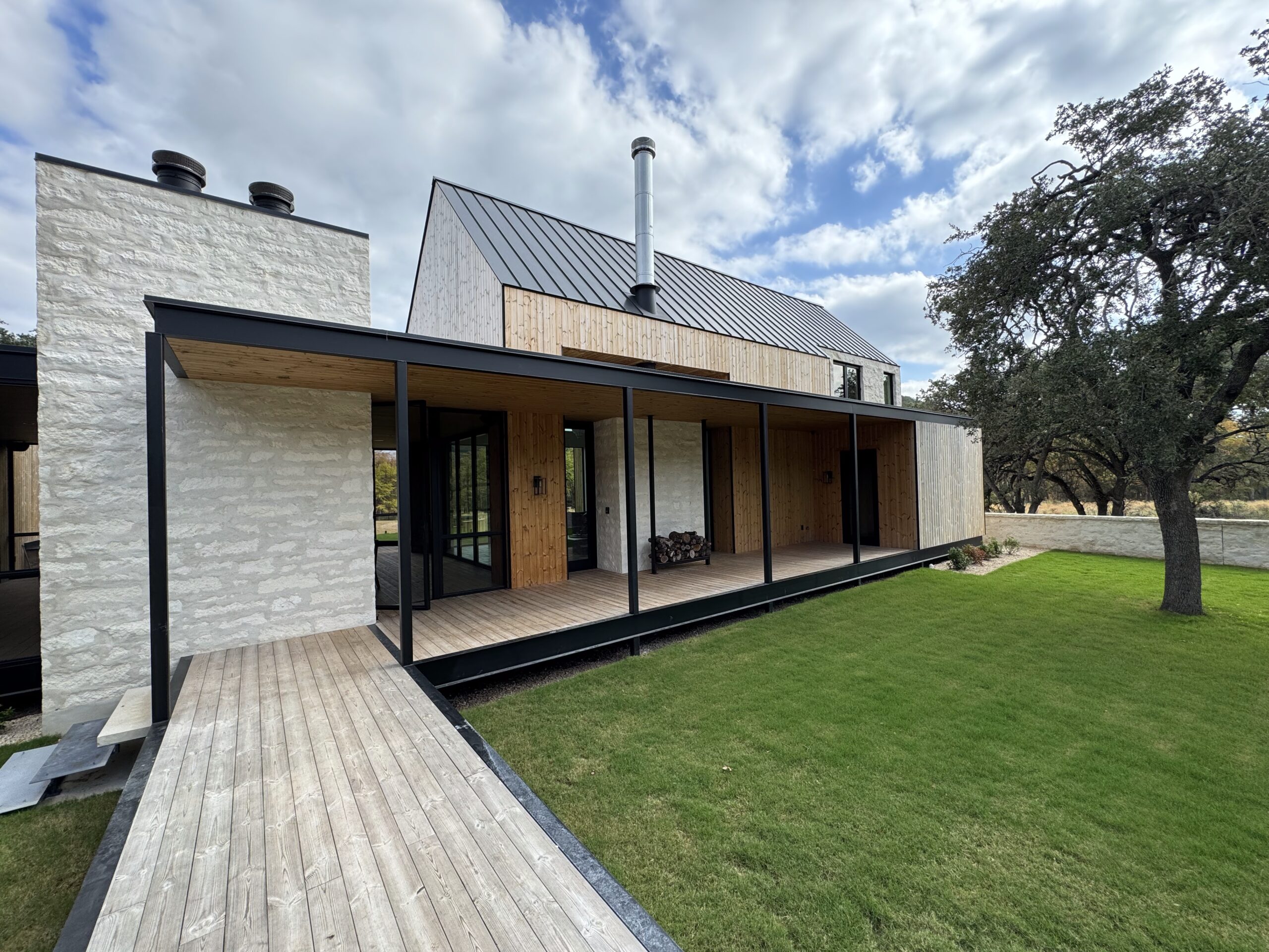 This residence is situated just off the Frio River in Concan, Texas. Conceptually, the house is organized as a suite of smaller buildings linked by a raised boardwalk and large screen porch.