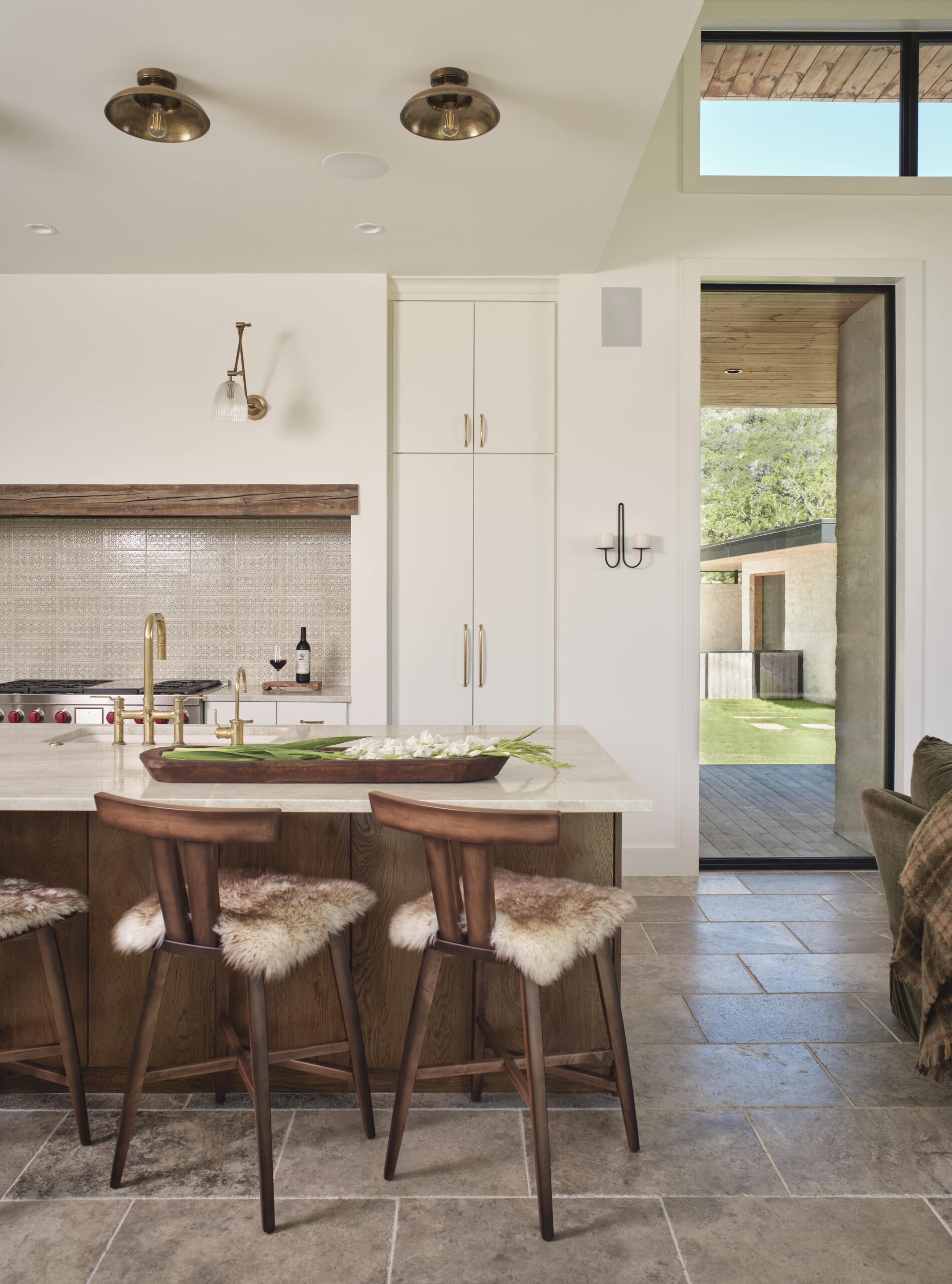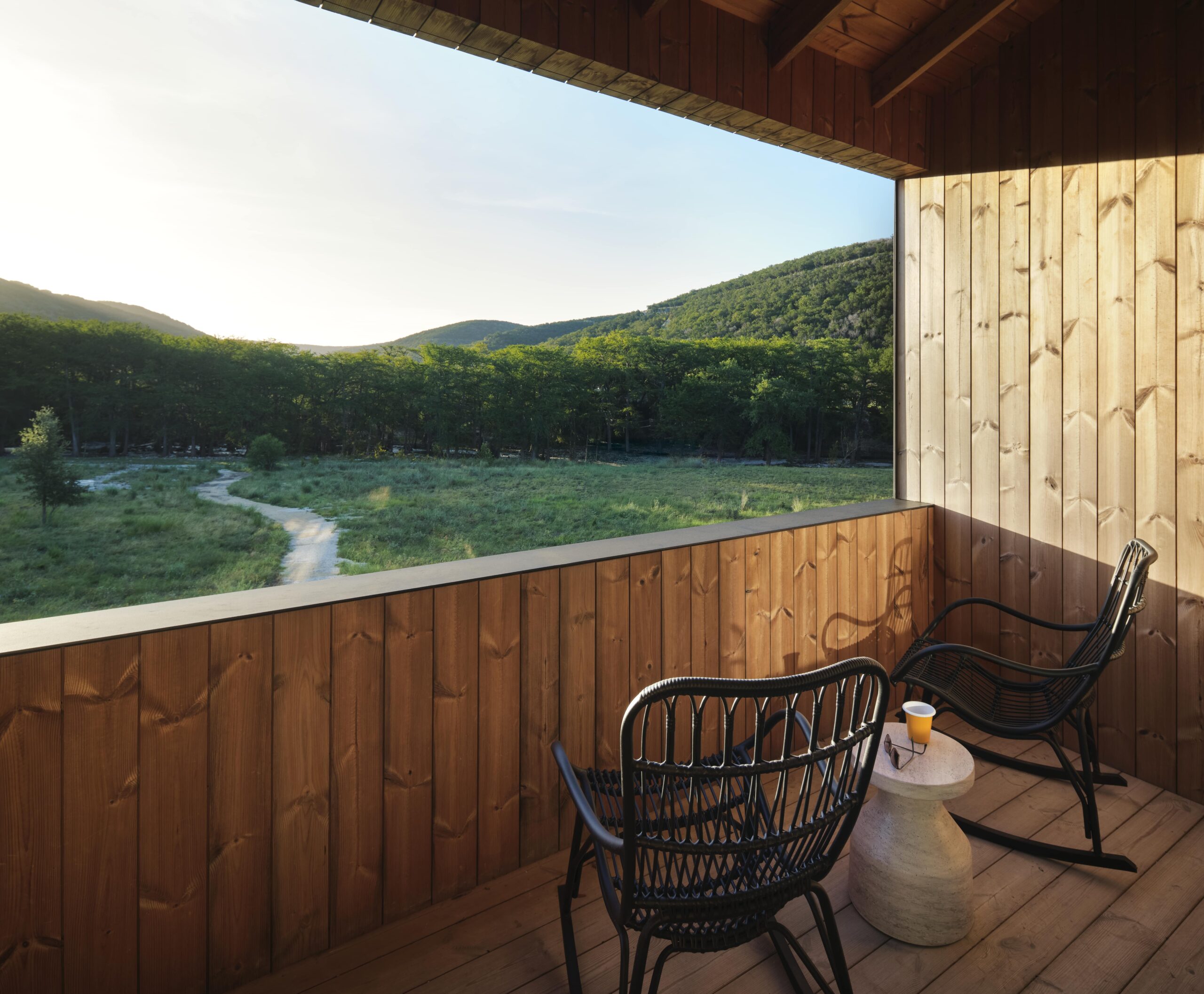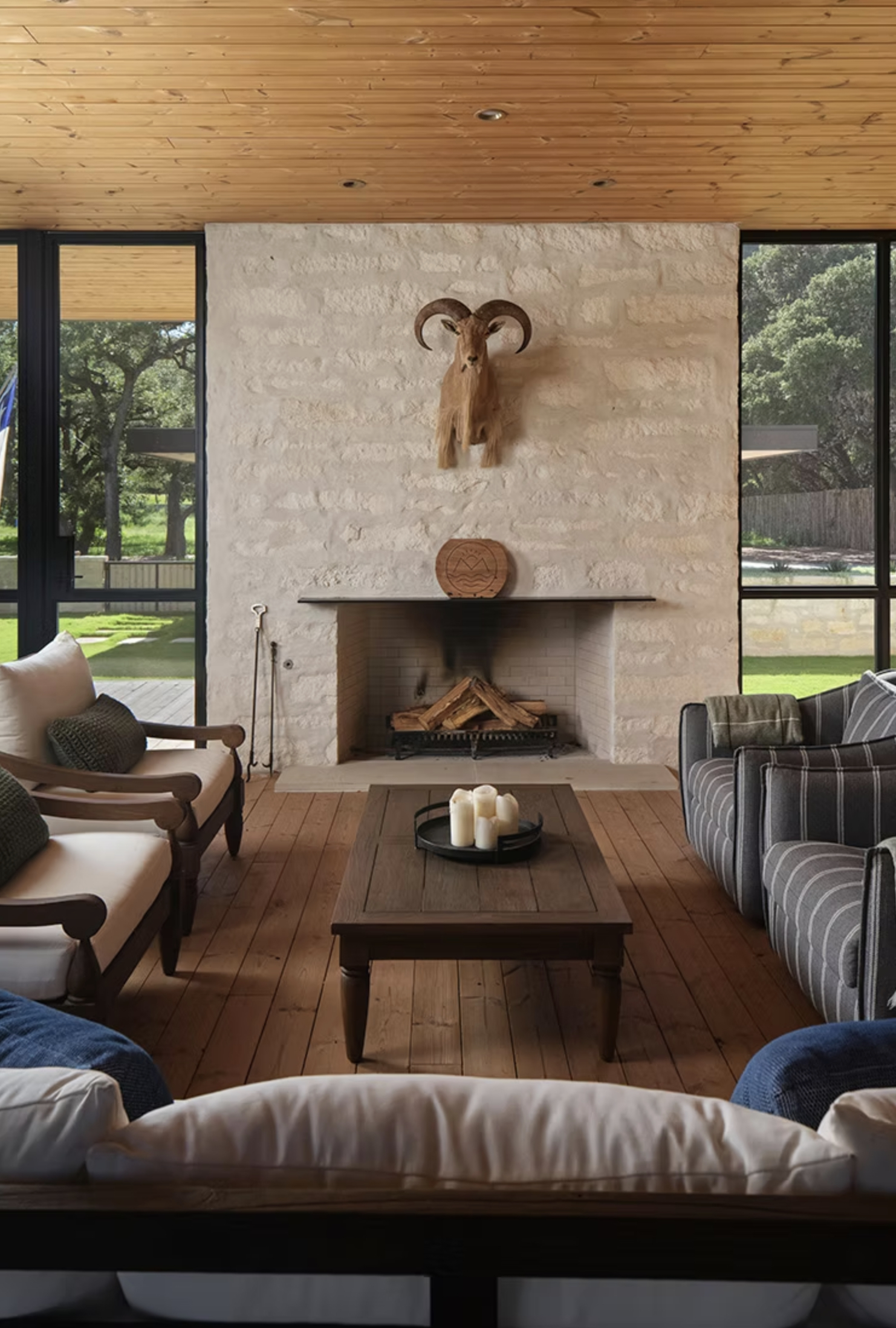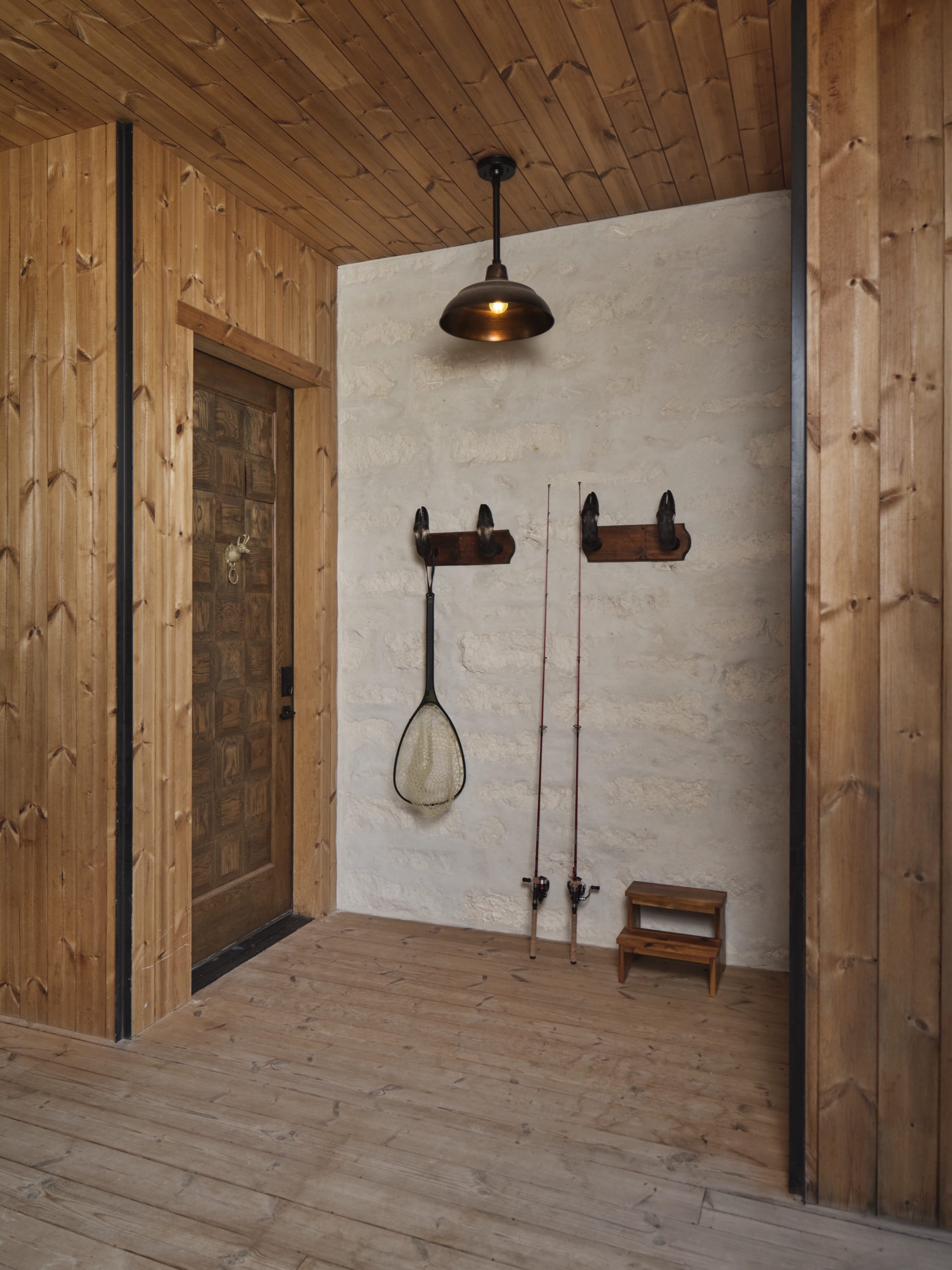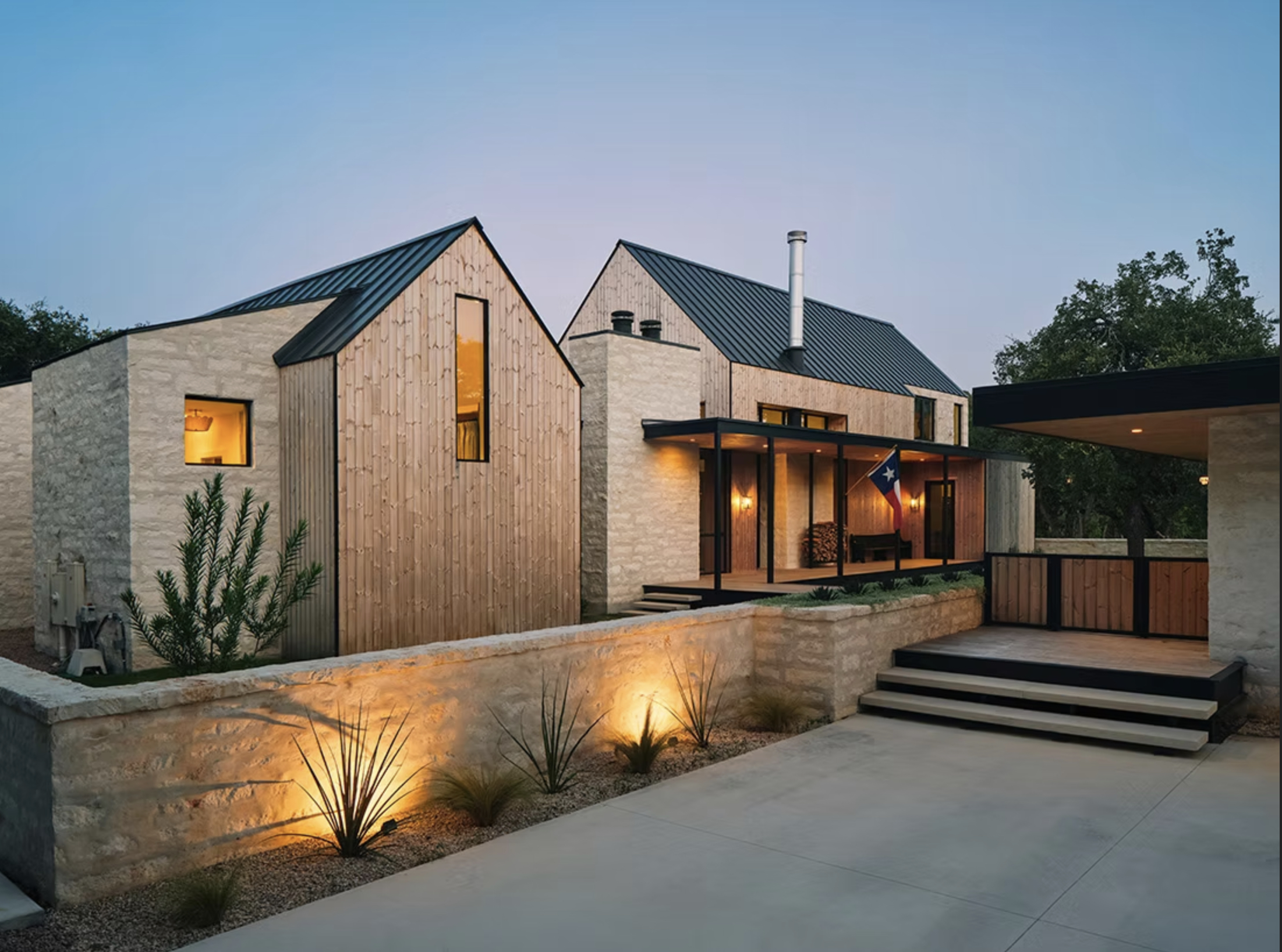 This residence is situated just off the Frio River in Concan, Texas. Conceptually, the house is organized as a suite of smaller buildings linked by a raised boardwalk and large screen porch.